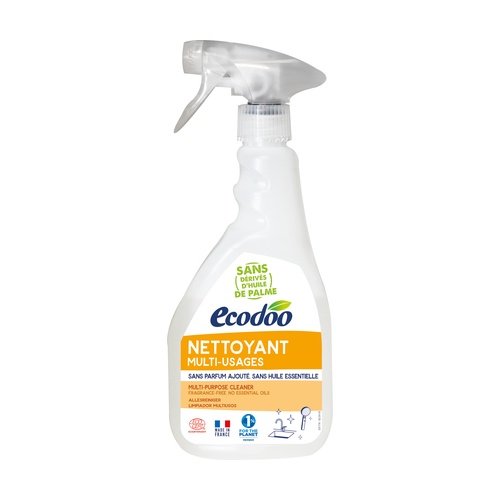 Hypoalergenní víceúčelový čistič Ecodoo připravený k použití pro údržbu kuchyně, koupelny a toalet. Jeho hypoalergenní formule respektuje citlivou pokožku. Tento čistič neobsahuje optické bělicí prostředky, éterické oleje ani barviva.