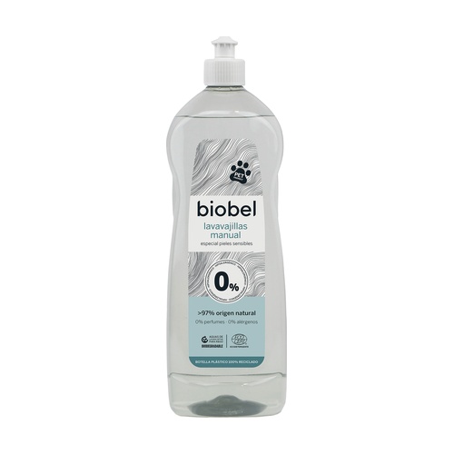 Ručně použitelný mycí prostředek na nádobí 0% od Biobel ekologický, vyrobený ze 97,42 % složek přírodního původu.
