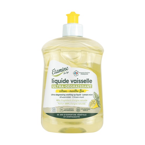 Perfektně myje nádobí a zároveň respektuje pokožku. Tento ekologický ultra odmašťovací mycí prostředek zaručuje rychlé schnutí bez zanechání stop. Organická tekutina má test biologické rozložitelnosti, který potvrzuje, že produkt bez ředění je během 28 dnů biologicky rozložen z 96 %.