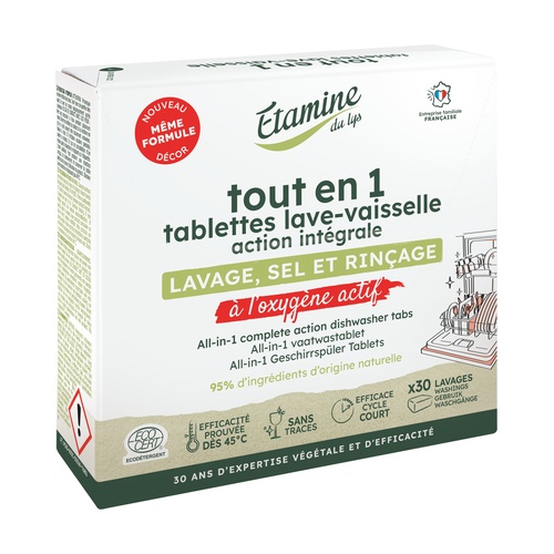Tablety Vše v 1 do myčky nádobí od Etamine du Lys čistí, odvápňují a vracejí lesk toaletním mísám.