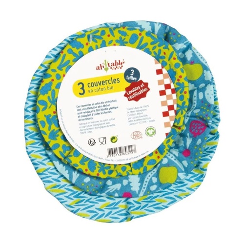 Přizpůsobitelné všem tvarům nádob (kulaté, obdélníkové, čtvercové atd.), pokličky z organické bavlny chrání a nechávají dýchat vaše kulinářské přípravy. Jsou omyvatelné, znovupoužitelné a dostupné v surové nebo potištěné organické bavlně (3 sady barevných potisků).