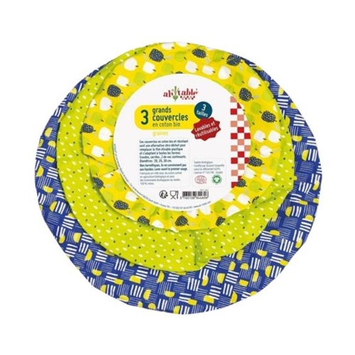 Přizpůsobitelné všem tvarům nádob (kulaté, obdélníkové, čtvercové atd.), víčka z organické bavlny chrání a nechávají dýchat vaše kulinářské přípravy. Jsou omyvatelná, znovupoužitelná a dostupná v surové organické bavlně nebo potištěná (3 sady barevných potisků).