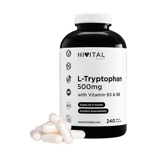L-Tryptofan 500 mg od Hivital je potravinový doplněk na bázi čistého L-tryptofanu, vitamínu B3 a vitamínu B6. Pomáhá zvýšit hladiny serotoninu a bojovat s úzkostí a stresem. Může také pomoci usnout a zlepšit náladu.