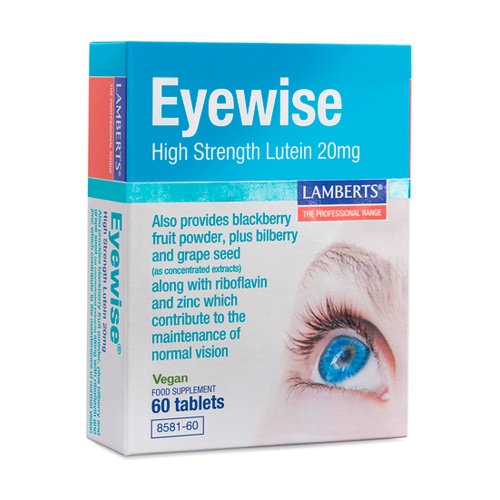 Eyewise od Lamberts je vyroben pro zrak. Obsahuje koncentraci 20 mg luteinu na tabletu, připraveného k absorpci (uvádíme skutečný obsah čistého luteinu, nikoli celkovou hmotnost sloučeniny).