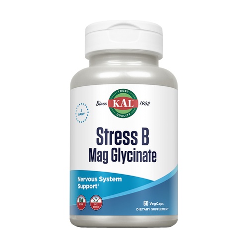 Stress B Mag Glicynate od Kal je doplněk stravy navržený k nutriční podpoře nervového systému a pomoci při svalové relaxaci díky kombinaci hořčíku a vitamínů skupiny B.