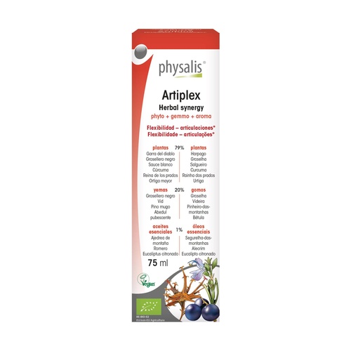 Artiplex de Physalis obsahuje ďáblův dráp, černý rybíz, vrbu, kurkumu a kopřivu, které přispívají ke zdraví a pružnosti kloubů. Navíc černý rybíz a vrba podporují svalovou pružnost.