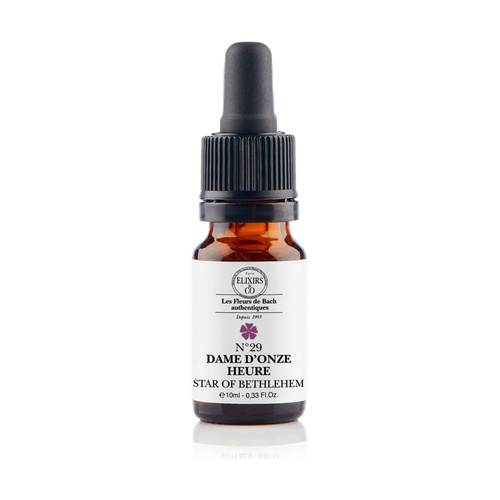 Produkt 29 Dame d'Onze heures od Elixirs & Co je určen pro ty, kteří zažili emocionální otřes, šok, zármutek. Pomáhá při útěše, utěšování bolestí. Uklidňuje, podporuje odvahu čelit. Přísně vyráběné v souladu s původní formulí Dr. Bacha, Bachovy květiny jsou přírodní přípravky vyrobené z divokých květin sbíraných v plné zralosti a ručně zpracovaných.