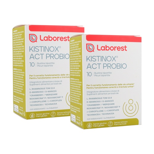 Pack Kistinox® Act PRObio je doplněk stravy na bázi L. rhamnosus TOM 22.8, D-Mannosio, brusinek, Noxamicina P, β-karyofylen a echinacey.