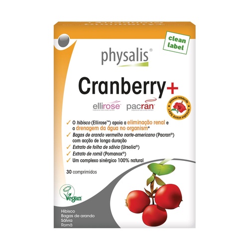 Cranberry+ Bio de Physalis je rostlinný doplněk stravy. Physalis Cranberry+ je synergický přírodní komplex 4 vědecky připravených rostlinných extraktů. Dlouhodobé působení Pacran®, směsi všech prospěšných látek z celé brusinkové bobule (proanthokyanidiny, organické kyseliny, fenoly, mastné kyseliny, vláknina…), je doplněno extraktem z květu ibišku (ElliroseTM).