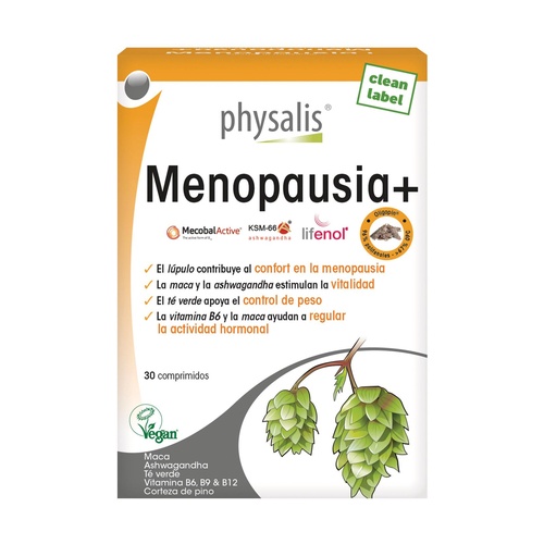 Physalis Menopausia+ je speciálně formulován tak, aby usnadnil tento přechod. Chmel (Lifenol) přispívá k pohodlí při menopauze a k relaxaci. Lepidium meyenii neboli peruánský ženšen hraje důležitou roli při zlepšování odolnosti a vitality, stejně jako zelený čaj, který nám pomáhá regulovat metabolismus tuků a váhu. Exkluzivní extrakt z kůry borovice přímořské (> 67 % oligoproantokyanidinů neboli OPC) usnadňuje krevní oběh (mikro-cirkulaci).