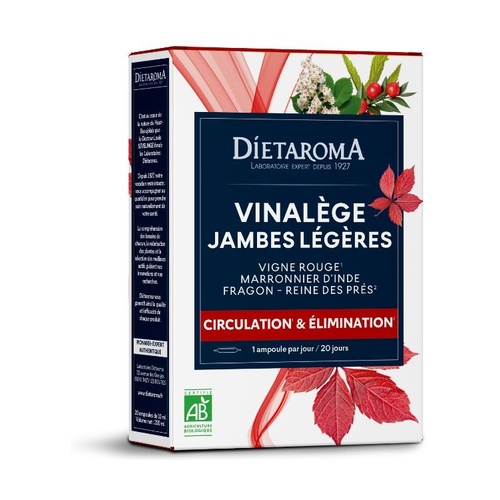 La Vinalège dvojí akce od Dietaroma je doplněk stravy formulovaný na bázi červeného vinné révy, kaštanu indického, hadího kořene, tužebníku jilmového. Červená vinná réva přispívá k normální cirkulaci v nohách.