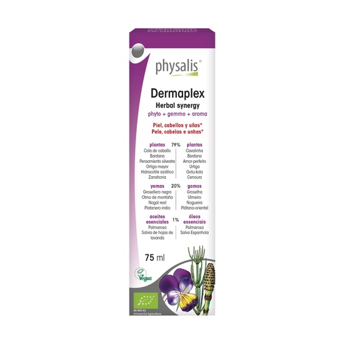 Dermaplex od Physalis je přírodní a výživný komplex složený z následujících rostlin: přeslička rolní, lopuch větší, violka trojbarevná, kopřiva a jilm, všechny prospěšné pro zdraví pokožky, vlasů a nehtů.