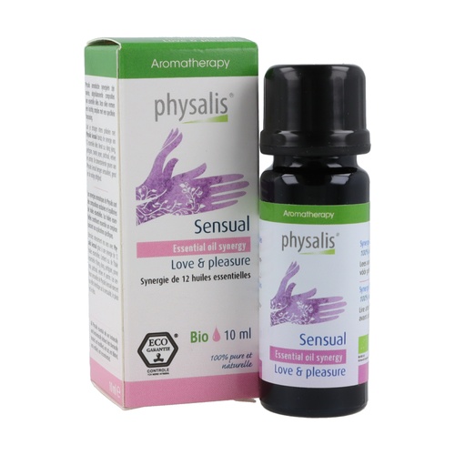 Bio esenciální olej Sensual od Physalis je vyroben z 12 esenciálních olejů. Obsahuje mimo jiné esenciální olej ylang ylang, petit grain, černý pepř, pačuli, vetiver a jasmín. Smyslné vůně Physalis Sensual mají blahodárný účinek na smyslnost, potěšení a touhu.