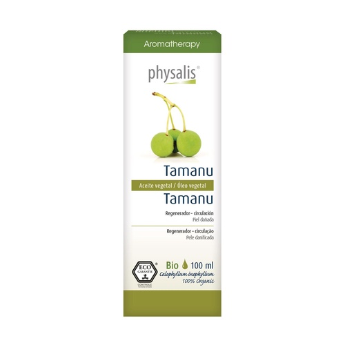 Bio rostlinný olej Tamanu z Physalis je zelenavý olej s hustou texturou a kořeněnou vůní, který se získává ze semen plodů stromu Calophyllum, původem z Asie. Tento olej hluboce regeneruje a zjemňuje pokožku v případě suchých oblastí, drobných ran, atopické pokožky, dlouhého vystavení slunci, jizevnaté tkáně a strií.