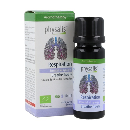 Respiration sinergia bio esenciální olej z Physalis je směs 16 esenciálních olejů pečlivě vybraných pro podporu pohody dýchacích cest, pomáhající volně dýchat a zajišťující okamžitý pocit pohodlí. Obsahuje mimo jiné esenciální olej z eucalyptus globulus a radiata, ravintsara, borovice lesní, červený tymián a pomeranč a tři druhy máty.