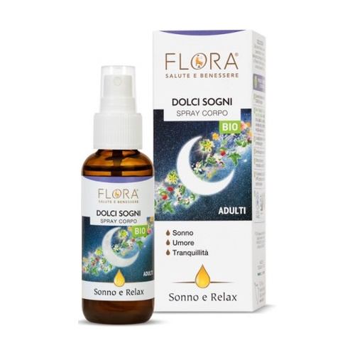 Tělový sprej Sladké sny pro dospělé od Flora zklidňující, utišující a relaxační. Vůně ideální pro usínání. S 100% čistými esenciálními oleji z pomeranče sladkého, bazalky, heřmánku, levandule, neroli (květ pomerančovníku), palmarosy, vanilky a ylang-ylang.