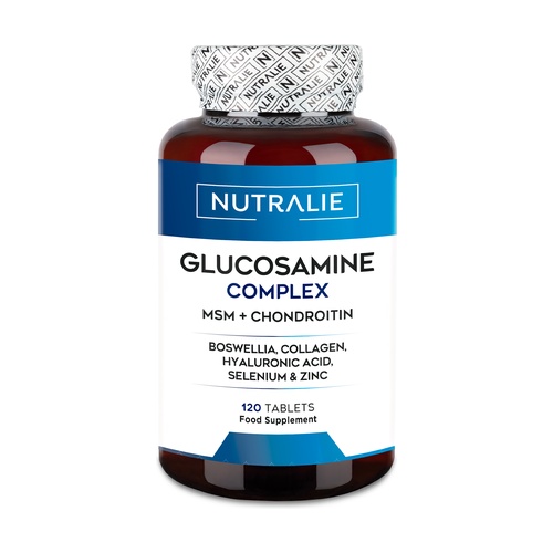 Glukosamin Complex od Nutralie obsahuje 1000 mg glukosaminu na denní dávku. Navíc přírodní formule obsahuje MSM (metylsulfonylmetan), chondroitin, boswellové kyseliny, kolagen, kyselinu hyaluronovou, selen a zinek, doplňující formuli, která má příznivé účinky na kosti a klouby.