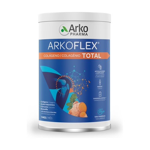 Arkoflex® Totalní kolagen od Arkopharma je doplněk stravy na bázi hydrolyzovaného a nativního kolagenu typu II, kyseliny hyaluronové, hořčíku, manganu, glukosaminu, chondroitinu, lithothamnia, boswellie, kurkumy a 7 vitamínů, navíc kombinace složek speciálně vybraných pro jejich přínosy pro pohybový aparát.