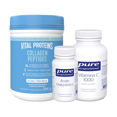 Nyní vám pomáháme užívat denní potřebné množství kolagenu s našimi peptidy kolagenu od Vital Proteins spolu s vitamínem C, který přispívá k normální tvorbě kolagenu pro udržení textury pokožky. Navíc vám kyselina hyaluronová pomáhá udržet hydrataci a texturu.