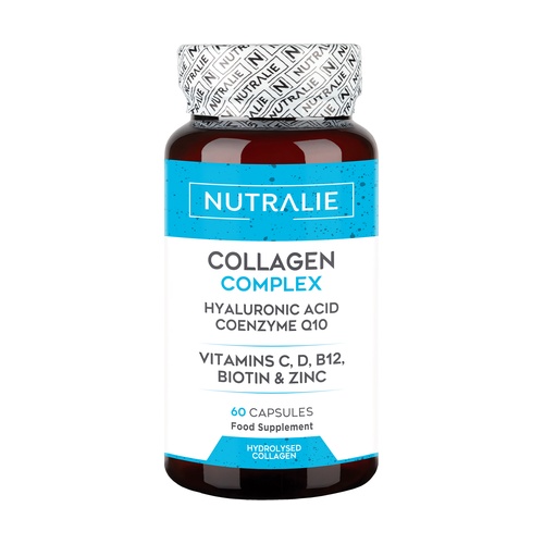 Colágeno Complex od Nutralie s 370 mg hydrolyzovaného kolagenu na kapsli, doplněný kyselinou hyaluronovou, ubichinonem, zinkem + vitaminy C, D, B12 a biotinem pro pokožku, kosti a klouby.