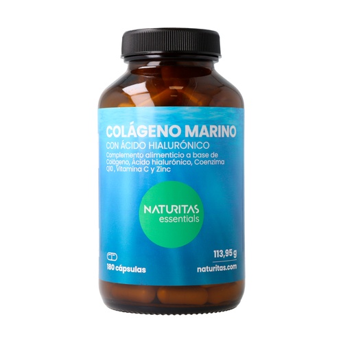 Hydrolyzovaný mořský kolagen (ryby), rostlinná kapsle (potahovací látka: hydroxypropylmetylcelulóza), bramborový škrob, kyselina L-askorbová, glukonát zinečnatý, sodná sůl kyseliny hyaluronové, koenzym Q10, protispékavá látka: hořečnaté soli mastných kyselin. Bez lepku, bez laktózy.