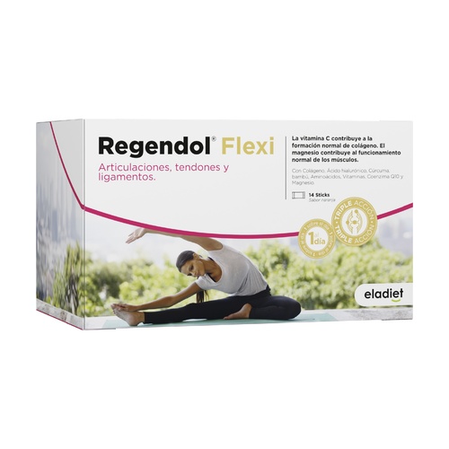 Regendol Flexi od Eladiet je doplněk stravy na bázi kolagenu, kyseliny hyaluronové, kurkumy, bambusu, vitamínů, koenzymu Q10, hořčíku, hlavních aminokyselin vazů a šlach a vitamínu C.