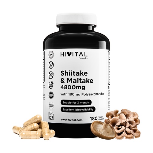 Shiitake & Maitake 4800mg od Hivital je doplněk stravy založený na přírodních extraktech shiitake a maitake, ekvivalent 4800 mg Shiitake + Maitake, přinášející 180 mg polysacharidů na dávku. Přírodní antioxidant, který může pomoci posílit imunitní a kardiovaskulární systém, usnadnit trávení a zvýšit energii.