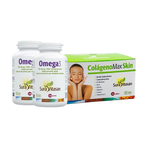 Balíček Omega 3 + dárek kolagen max skin od Sura Vitasan; Zahrnuje dvě Omega 3 po 120 perlách a jako dárek kolagen max skin v balení po 30 sáčcích s tržní hodnotou 43,14€.