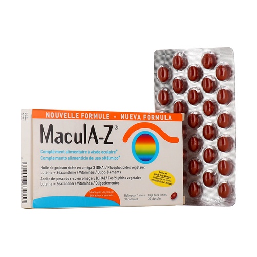 - Rybí olej: Kyselina dokosahexaenová (DHA) je mastná kyselina patřící do rodiny omega 3. Přispívá k udržení normálního zraku. Oleje použité v MaculA-Z byly podrobeny specifické úpravě, aby se zabránilo rybímu zápachu a chuti.