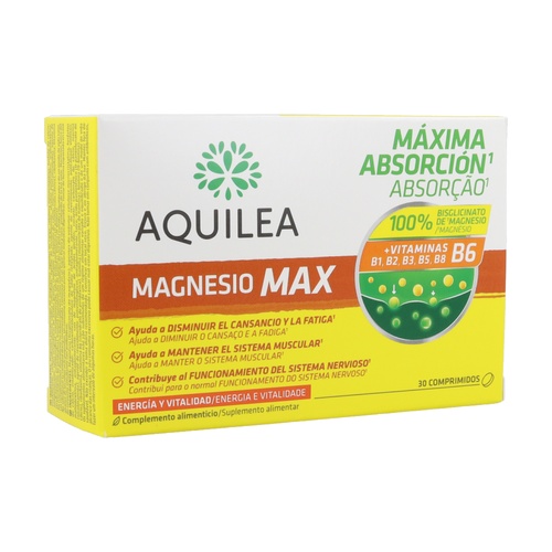 Aquilea Magnesio Max od Aquilea je doplněk stravy, který vám pomáhá snižovat únavu a vyčerpání. Přispívá k normální funkci svalů a k udržení kostí a normální funkci nervového systému. Navíc obsahuje vitamíny skupiny B (B1, B2, B3, B5, B6 a B8), které pomáhají normálnímu energetickému metabolismu.
