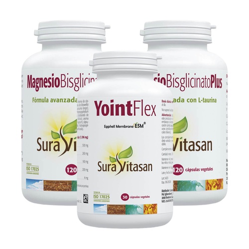Balíček Hořčík bisglycinát plus + Dárek Yoint flex od Sura Vitasan; Obsahuje dva Hořčík bisglycinát plus po 120 kapslích a jako dárek Yoint flex 30 kapslí s hodnotou 32,81€ na trhu.