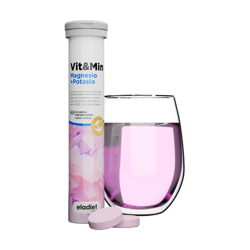 Vit&Min Hořčík + Draslík od Eladiet je potravinový doplněk, který přispívá ke snížení únavy a vyčerpání, k rovnováze elektrolytů, k normálnímu energetickému metabolismu, k normální funkci nervového systému a k normální svalové funkci.