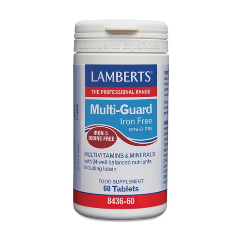 Multi-guard® iron free od Lamberts je doplněk stravy založený na multinutrientech, kromě železa a jódu. Je tedy ideální také pro ty, kteří jsou citliví na železo, pro ženy a muže po menopauze starší 50 let, kteří potřebují méně železa ve své stravě s přibývajícím věkem, nebo pro ty s problémy se štítnou žlázou.