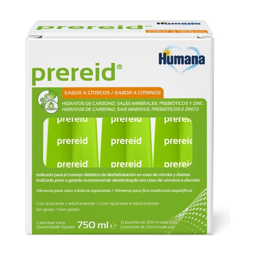 Prereid® od Humana je potravina založená na vyvážené směsi sacharidů, minerálních solí, prebiotických vláken a zinku určená pro dietní zvládání dehydratace při zvracení a/nebo průjmu.