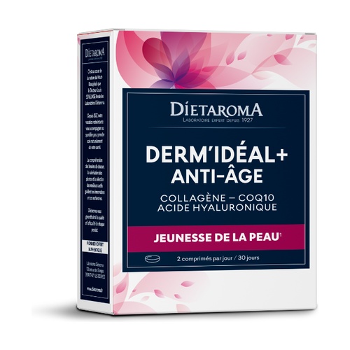 Dermidéal Plus od Dietaroma, s mořským kolagenem, kyselinou hyaluronovou a koenzymem Q10, pochází z bakteriální biofermentace a přírodní vitamín C dodaný extraktem z aceroly.