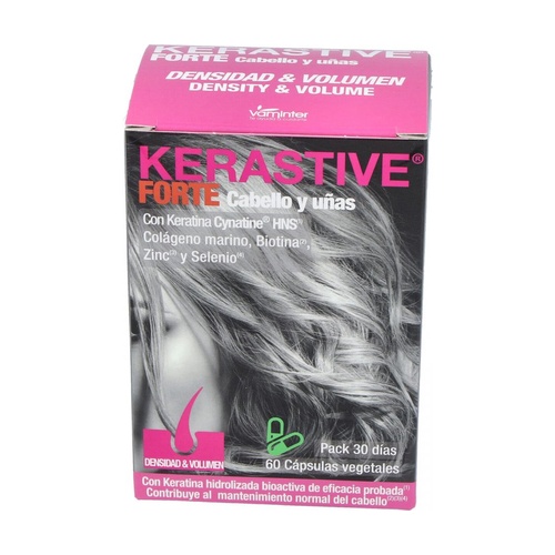 Kerastive® forte vlasy a nehty obsahuje přírodní hydrolyzovaný keratin Cynatine® HNS s vysokou biologickou dostupností. Zinek ve formě bisglycinátu pomáhá udržovat normální stav vlasů a přispívá k syntéze bílkovin, jako je keratin. Biotin a selen působí synergicky pro udržení zdravých, pevných a objemných vlasů.
