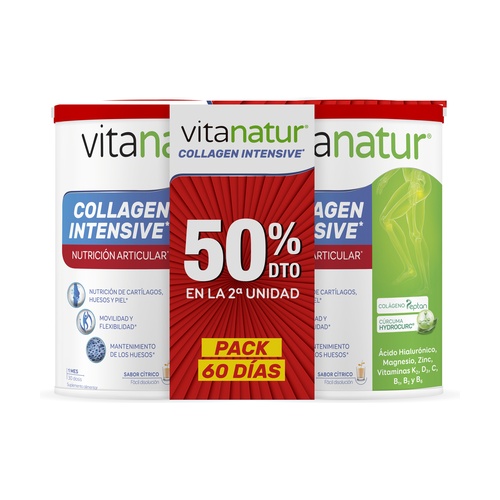 Vitanatur Collagen intensive od Vitanatur je doplněk stravy na bázi hydrolyzovaného kolagenu, extraktu kurkumy, kyseliny hyaluronové, hořčíku, zinku a vitaminů K2, D3, C, B1, B2 a B6.