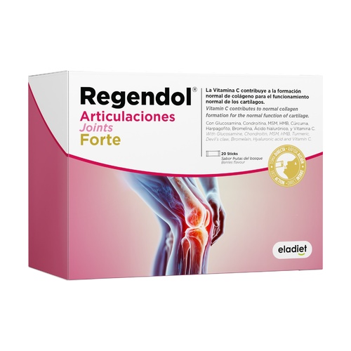 Regendol Articulaciones Forte od Eladiet je doplněk stravy na bázi rostlinné glukosaminu, chondroitinu*, MSM, kyseliny hyaluronové a extraktů tradičních rostlin a vitamínu C, který přispívá k normální tvorbě kolagenu pro normální funkci chrupavek. Usnadňuje kloubní pohodu. Kurkuma pomáhá zmírnit svalovou a kloubní bolest.