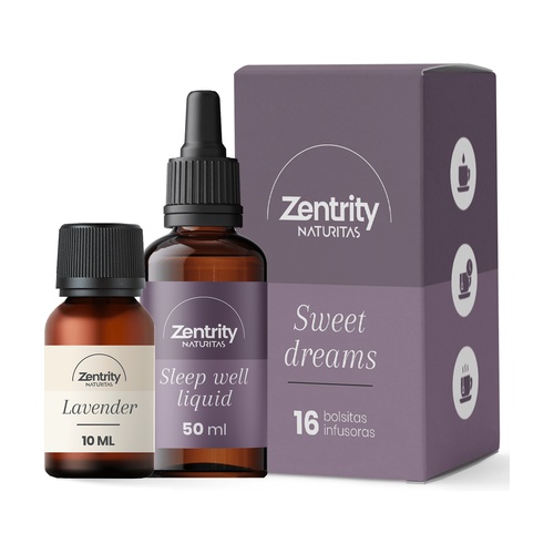 Balíček pro regenerační spánek od Zentrity by Naturitas obsahuje dva z našich nejlepších pomocníků pro odpočinek; bio esenciální olej z levandule 10 ml, Sleep well liquid 50 ml a bio bylinné čaje Sweet dreams (meduňka a mučenka) s 16 nálevovými sáčky.
