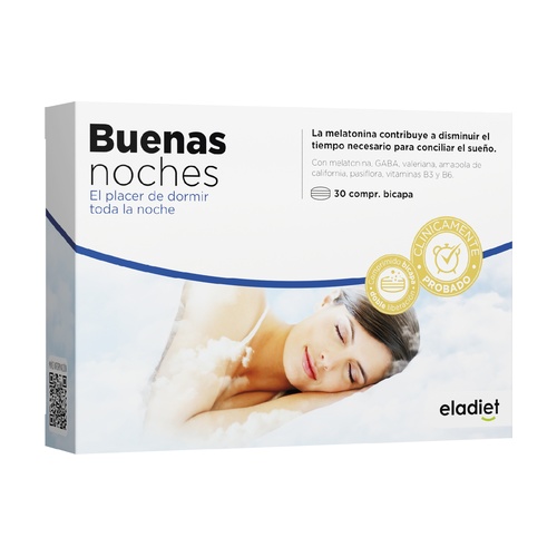 Buenas Noches de Eladiet je doplněk stravy na bázi melatoninu, GABA, kozlíku lékařského, kalifornského máku, mučenky, vitamínu B3 a B6.