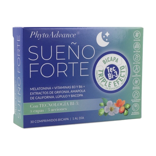 SUEÑO FORTE je doplněk stravy s technologií BI-3 (dvě vrstvy / 3 účinky), s okamžitým a prodlouženým účinkem po celou noc.