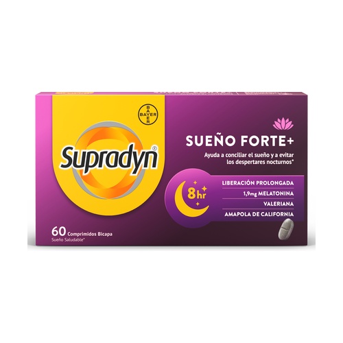 Supradyn® Sueño Forte+ je doplněk stravy, který díky dvouvrstvé technologii svého tabletu, s 1,9 mg melatoninu s prodlouženým uvolňováním a kombinací extraktů přírodního původu z kozlíku lékařského a kalifornského máku s uklidňujícím a zklidňujícím účinkem, usnadňuje usínání a pomáhá udržovat relaxaci během noci. Jedna tableta pomáhá zajistit regenerační spánek.