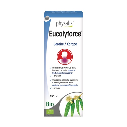 Eucalyforce Bio sirup z Physalis působí uklidňujícím a zklidňujícím účinkem na dýchací cesty a hrdlo. Tento sirup obsahuje kombinaci rostlinných extraktů (tymian, pelargonie) a éterických olejů (eukalyptus, máta, borovice a tymian), které usnadňují dýchání.