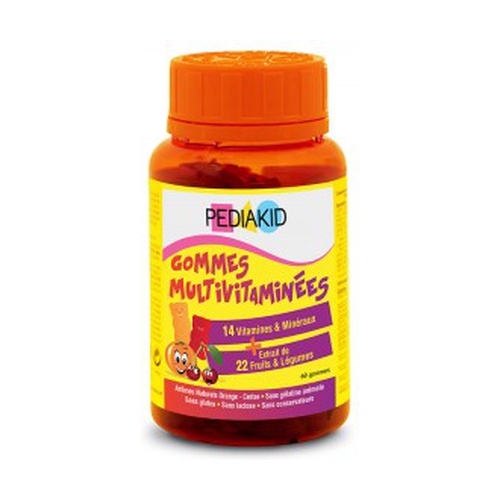 Multivitaminové žvýkačky Pediakid jsou doplněk stravy, který pomáhá snižovat únavu a udržovat imunitní systém. Jsou formulovány na bázi patentovaného extraktu z 22 druhů ovoce a zeleniny, vitamínů A, C, E, K, B1, B2, B3, B5, B6, B8, B9, B12, selenu a zinku.