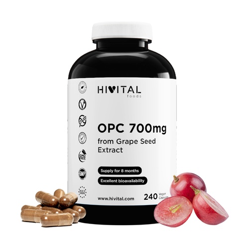 OPC Semeno hroznového vína 700 mg od Hivital založený na extraktu ze semen hroznového vína s 99 % OPC (oligomerní proanthokyanidiny), vynikající antioxidant s protizánětlivými a kardioprotektivními vlastnostmi.