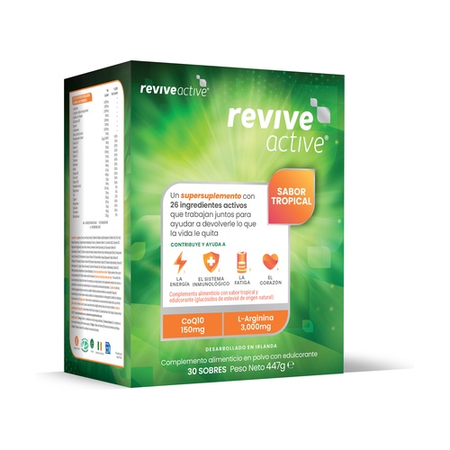 Revive active je superdoplněk s 26 aktivními složkami, které zahrnují 11 vitamínů, 7 minerálů a 5 aminokyselin, vše v denním sáčku.Vlastnosti a přínosy Revive active tropická energie
