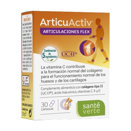 ArticuActiv® Articulaciones Flex je výživový doplněk s kolagenem typu II (UC-II°), kyselinou hyaluronovou, vitamíny C, K a D.