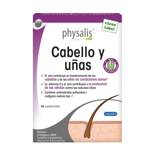 Physalis Vlasy a nehty je přírodní výživový komplex, který obsahuje zinek ve formě chelátu (maximální biologická dostupnost), jež přispívá k kráse a zdraví vlasů a nehtů. Biotin (nebo vitamin H) a vitamin B6 podporují metabolismus bílkovin, zatímco vitamin C a zinek se podílejí na ochraně buněk proti volným radikálům. Obsahuje také organický křemík z bambusu, hydrolyzovaný kolagen typu 1 (Naticol®), L-arginin, MMS a sírou obsahující aminokyseliny L-cystein a L-methionin.