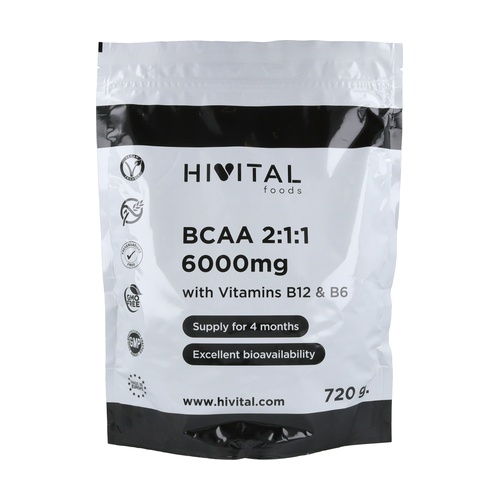 BCAA 2:1:1 6000mg od Hivital je doplněk stravy založený na třech BCAA (L-Leucin, L-Isoleucin, L-Valin), vitamínu B6 a vitamínu B12. BCAA mohou pomoci růstu a regeneraci svalů a regulaci metabolismu.