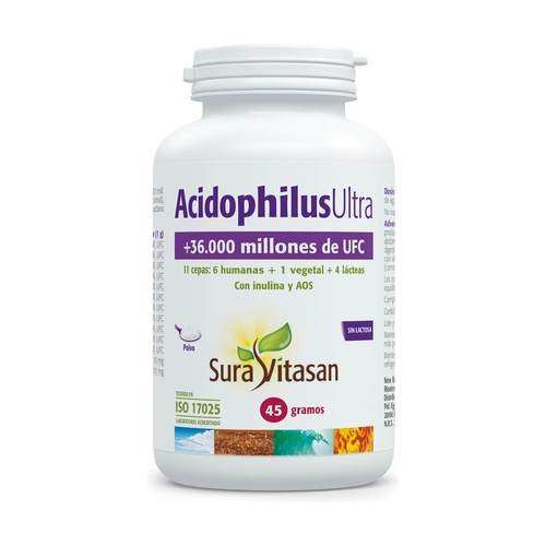 Acidophilus Ultra prášek od Sura Vitasan je silná a pokročilá kombinace 11 vybraných bakteriálních kmenů, F.O.S (čekanka) a A.O.S (modřín). Dodává minimálně 36 miliard životaschopných bakterií na dávku.